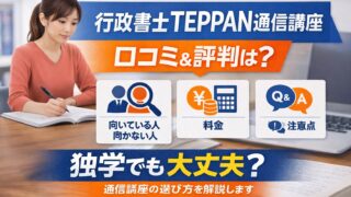 行政書士TEPPAN通信講座の口コミ・評判を整理し、メリット・デメリット、料金、向いている人・向かない人、注意点まで分かりやすく解説します。独学から通信講座への切り替えを検討している方に役立つ内容です。